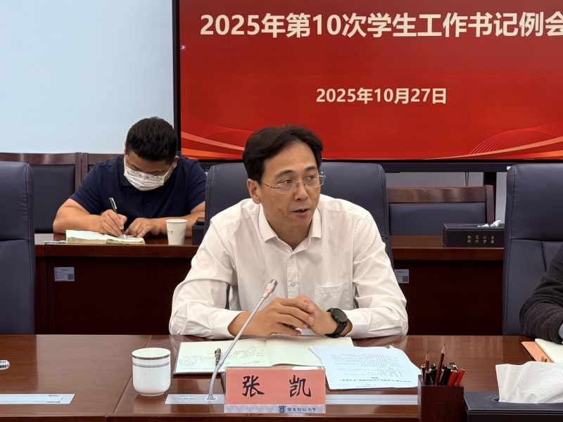 为深入贯彻落实立德树人根本任务,全面统筹学生工作重点任务落地,切实提升学生管理服务水平,10 月 27 日上午,学工部在同德楼第一会议室召开2025年第10次学生工作书记例会。副校长张凯出席会议并作总结讲话,学生工作部部长钟智主持会议。各学院学生工作书记及辅导员代表参加会议。
