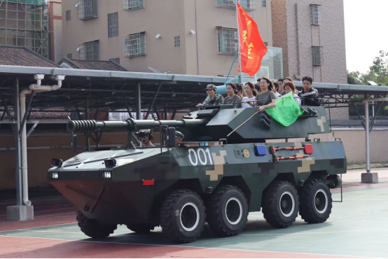 随后,同学们通过搭建罗马炮、水弹攻防战、乘坐装甲车等活动沉浸式解锁硬核军事体验。