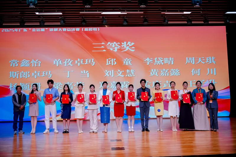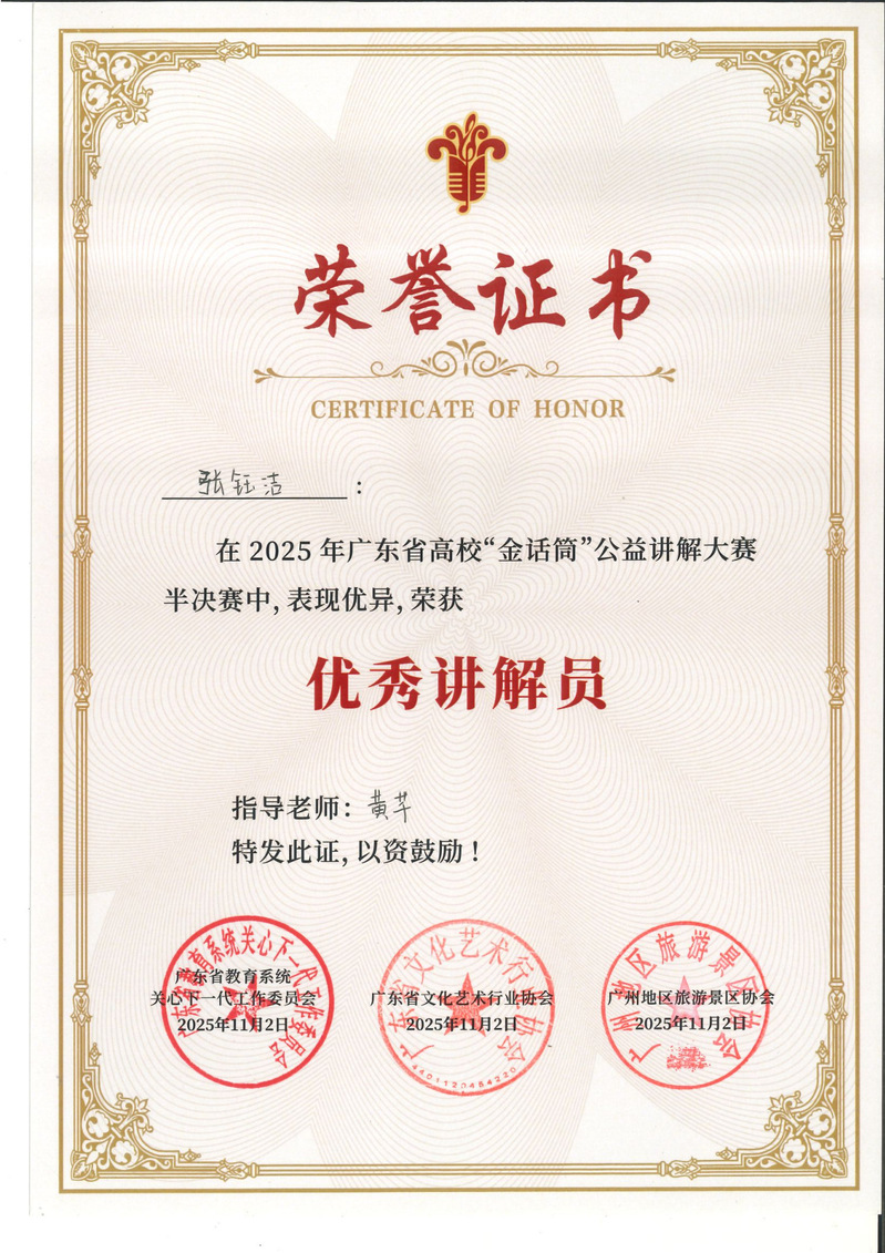 11月19日,2025年广东“金话筒”公益讲解大赛决赛在广州市图书馆落下帷幕。学工部联合湾区影视产业学院等学院系统推进选手选拔、培训与参赛保障工作,我校两位学生在决赛中荣获佳绩。其中,湾区影视产业学院周天琪同学获得三等奖和最佳人气奖,张钰洁同学获得“优秀讲解员”荣誉。