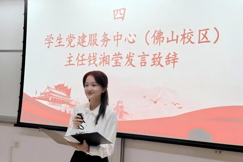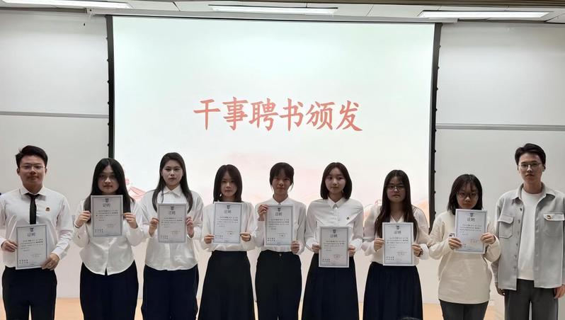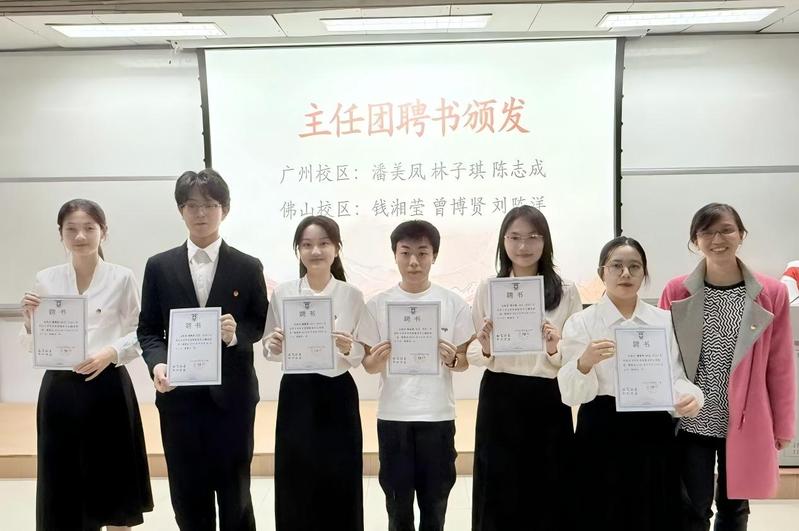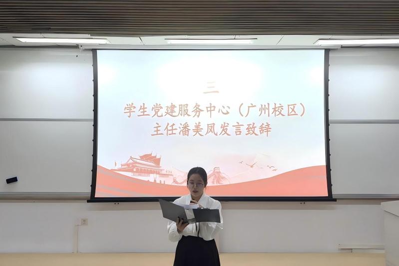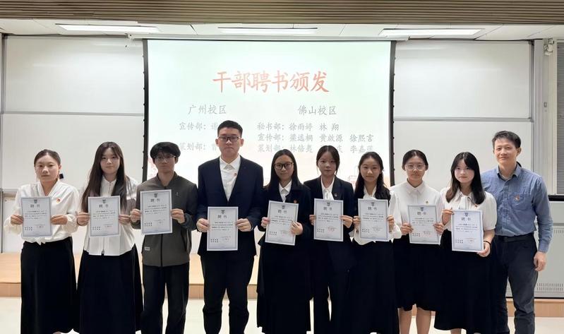 成立大会在庄严的国歌声中拉开序幕,紧接着与会人员共同回顾了上届学生党建服务中心的工作成果。广州校区中心主任潘美凤结合两年在学生党建服务中心的工作经历,分享自身成长感悟,承诺将以饱满热忱带领团队提升工作质量。佛山校区中心主任钱湘莹感谢学校领导和老师的培养支持,提出了“创品牌、强联动、优支撑”的未来发展方向。新干事代表茹毅表达了加入中心的荣幸,承诺将积极学习、主动作为,投身学生党建服务工作中。最后,参会老师为新一届学生党建服务中心全体成员颁发聘书。