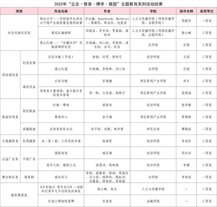 近日,由广东省教育厅主办的2025年“立志·修身·博学·报国”主题教育系列活动获奖结果正式公布。我校师生凭借扎实的作品质量与新颖的创作思路,在多个赛道脱颖而出,共获得16个奖项,其中一等奖4项、二等奖3项、三等奖9项。