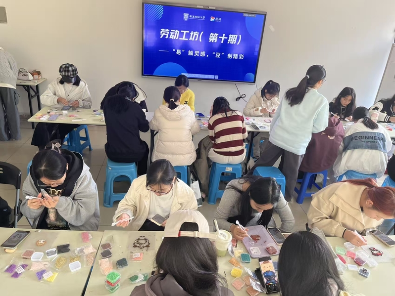 活动中,同学们全神贯注,化身“能工巧匠”,手持小镊子,小心翼翼地将一颗颗微小的豆粒按照心中的图案在模板上精心拼凑。有的同学选择了可爱的卡通形象,有的则构思了精美的几何图案,还有的将校徽、易班熊等元素融入创作。期间,同学们不时相互交流构思、分享技巧,现场充满了专注的氛围与欢声笑语。