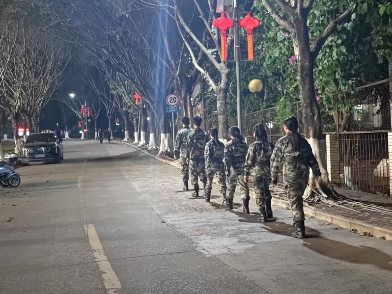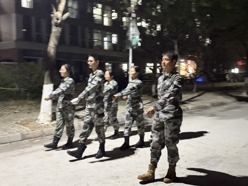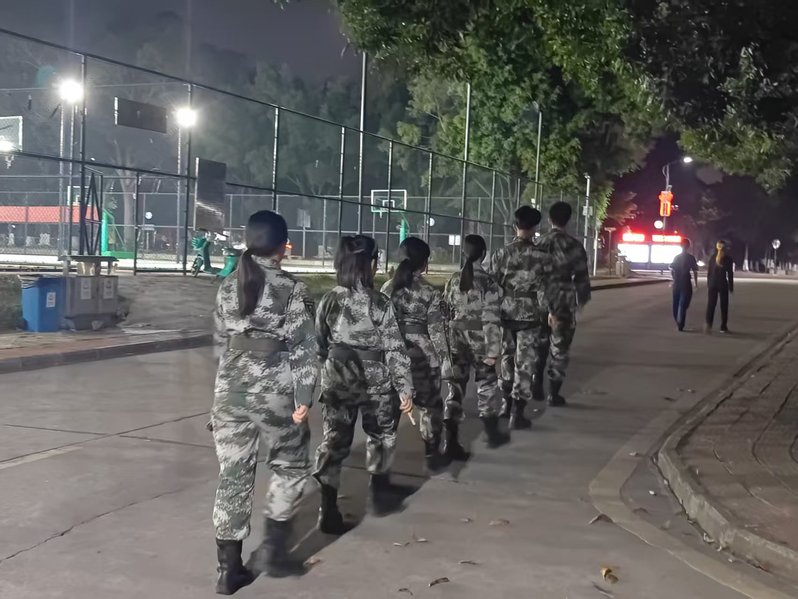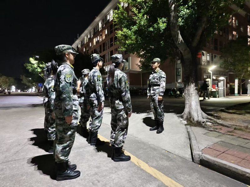 巡逻队聚焦校园安全重点,以每晚20:00至21:00为巡逻时段,在两校区同步开展校园安全巡逻工作。队员们身着整齐迷彩服,采取“定点值守+动态巡逻”模式,以校园主干道、教学楼、宿舍区等师生密集区域为核心,细致排查各类安全隐患,全力防范校园安全风险,切实做到守土有责、守土尽责。巡逻不止于“防”,更暖于“护”。队员们秉持“安全第一、服务师生”理念,及时汇报安全漏洞,形成“发现—处置—反馈—整改”闭环管理,以朋辈力量推动“平安校园”建设走深走实。